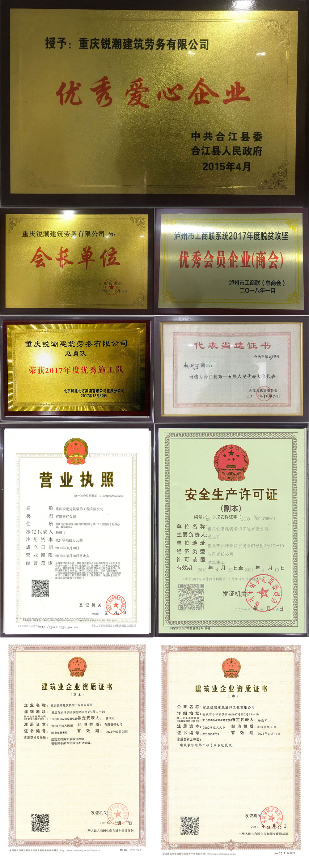 重慶銳潮建筑工程有限公司成立于2006年,注冊資金2060萬元,擁有建筑工程總承包三級專業(yè)資質(zhì)、裝飾裝修工程二級專業(yè)資質(zhì)、模板腳手架專業(yè)資質(zhì)、勞務(wù)分...